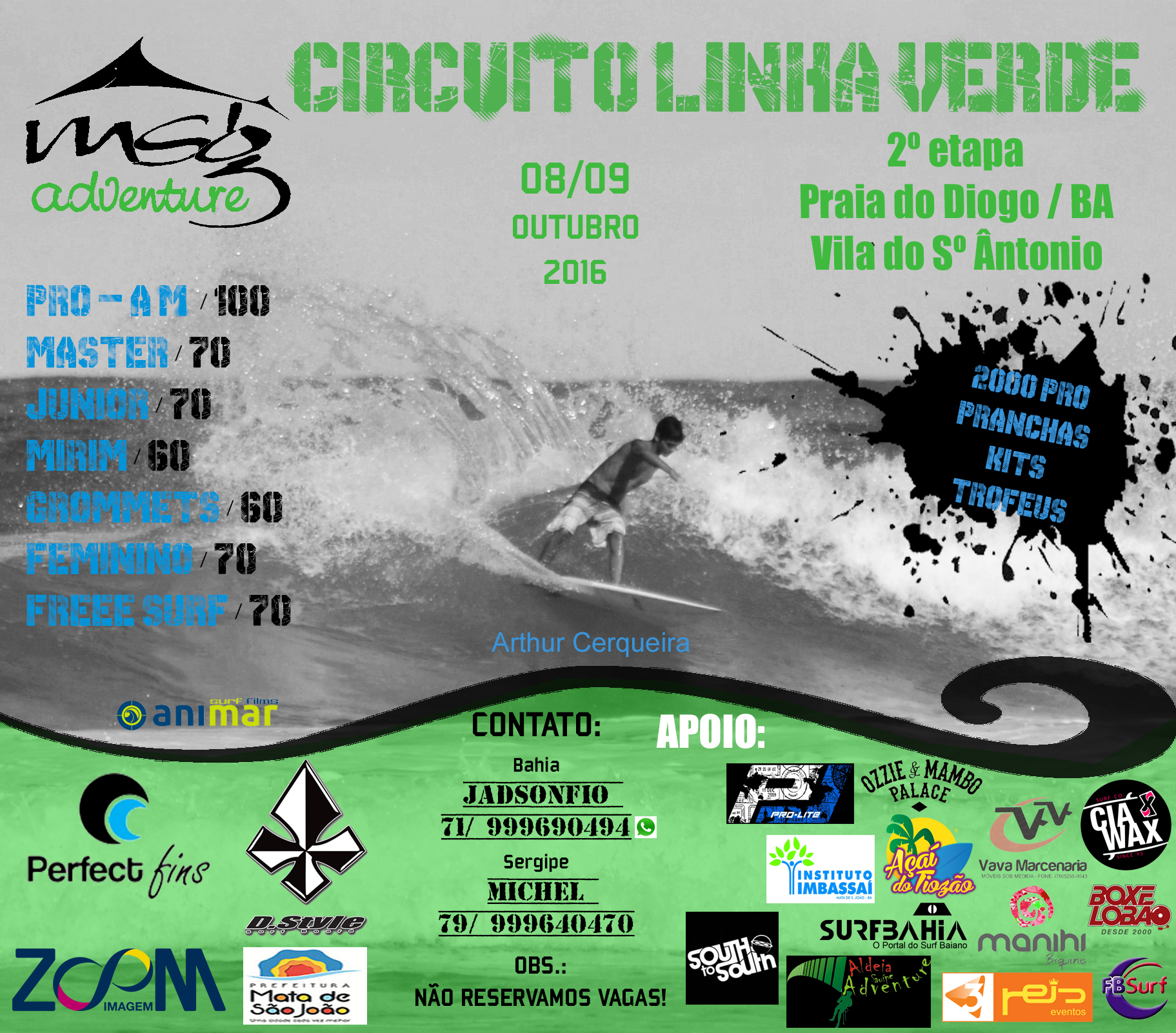 As inscrições custarão R$ 100 para a Pro/Am, R$ 70 para a Master, Junior, Feminino e Freesurf, e R$ 60 na Mirim e Grommets. As inscrições podem ser feitas através de depósito ou transferência na conta poupança 19277-5, ag. 2799-5, no Banco do Brasil, em nome de Jadson Ribeiro dos Santos.
