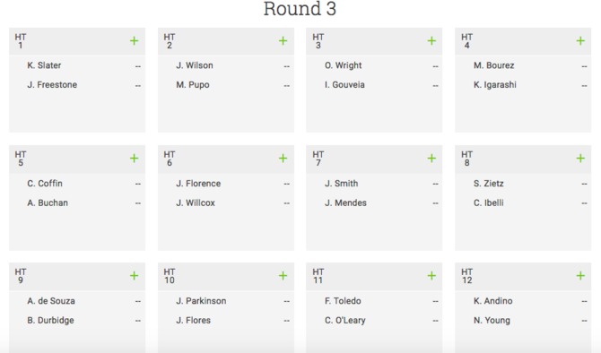 O Brasil continua disputando classificação no confronto seguinte, com Adriano de Souza enfrentando o veterano Bede Durbidge. E Filipe Toledo fecha a participação verde-amarela contra outro australiano na 11.a bateria, Connor O´Leary. Esse confronto reúne os dois surfistas que venceram os últimos rankings do WSL Qualifying Series, Filipe em 2015 e Connor em 2016 se classificando pela primeira vez para a divisão de elite do surfe mundial.