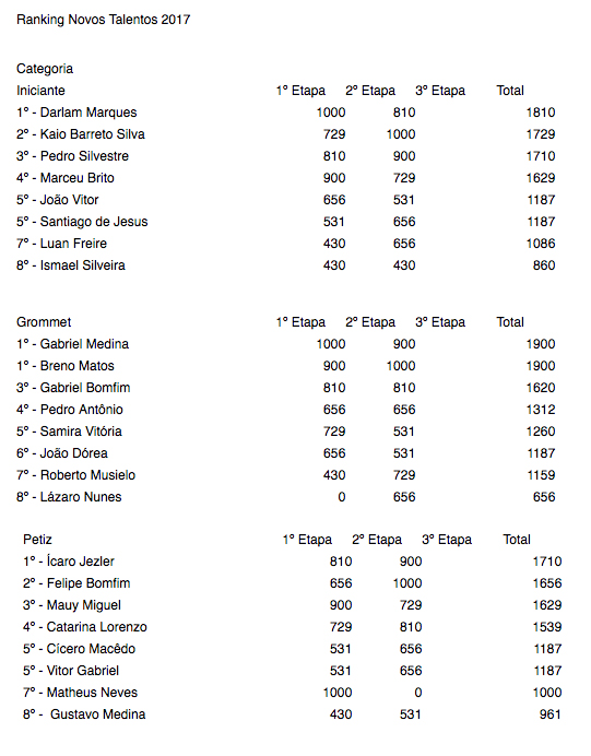 Os destaques dessa etapa foram Felipe Bomfim, campeão Petiz, Breno Matos, campeão da Grommet, e Kaio Silva, campeão da Iniciante.