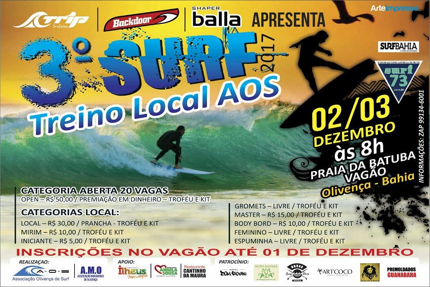 Acontece nos dias 2 e 3 de dezembro, a terceira etapa do Surf Treino Local AOS (Associação Olivença de Surf), na praia da Batuba, em Olivença.