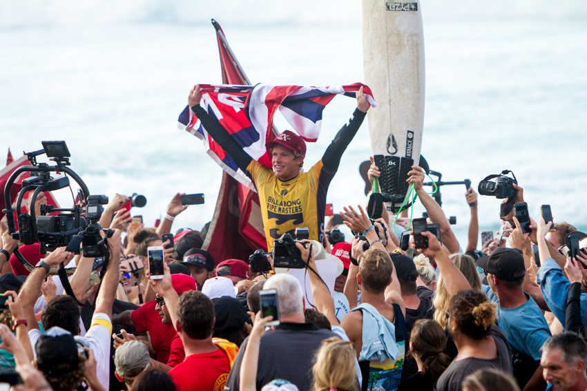 | John John Florence comemora a conquista do seu segundo título mundial. Foto: WSL / Heff |