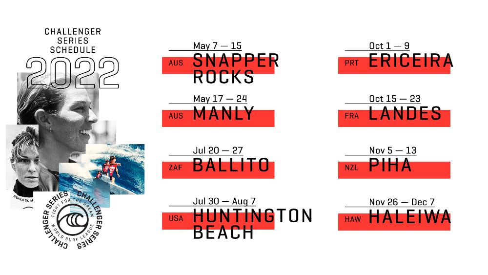 O WSL Challenger Series 2022 será disputado em seis países, começando em maio na Austrália, passando pela África do Sul, Estados Unidos, Portugal, França, Nova Zelândia, terminando em Haleiwa Beach, em novembro no Havaí. A praia de Snapper Rocks, na Gold Coast, que foi o palco de abertura do WSL Championship Tour desde 1998, agora sediará a primeira etapa do WSL Challenger Series no mês de maio.