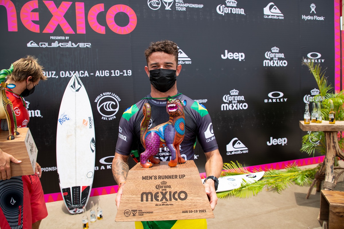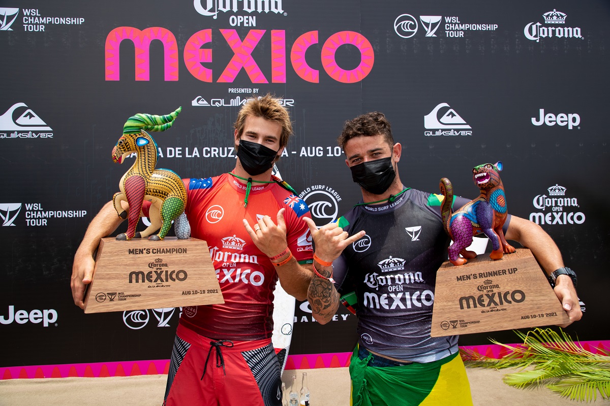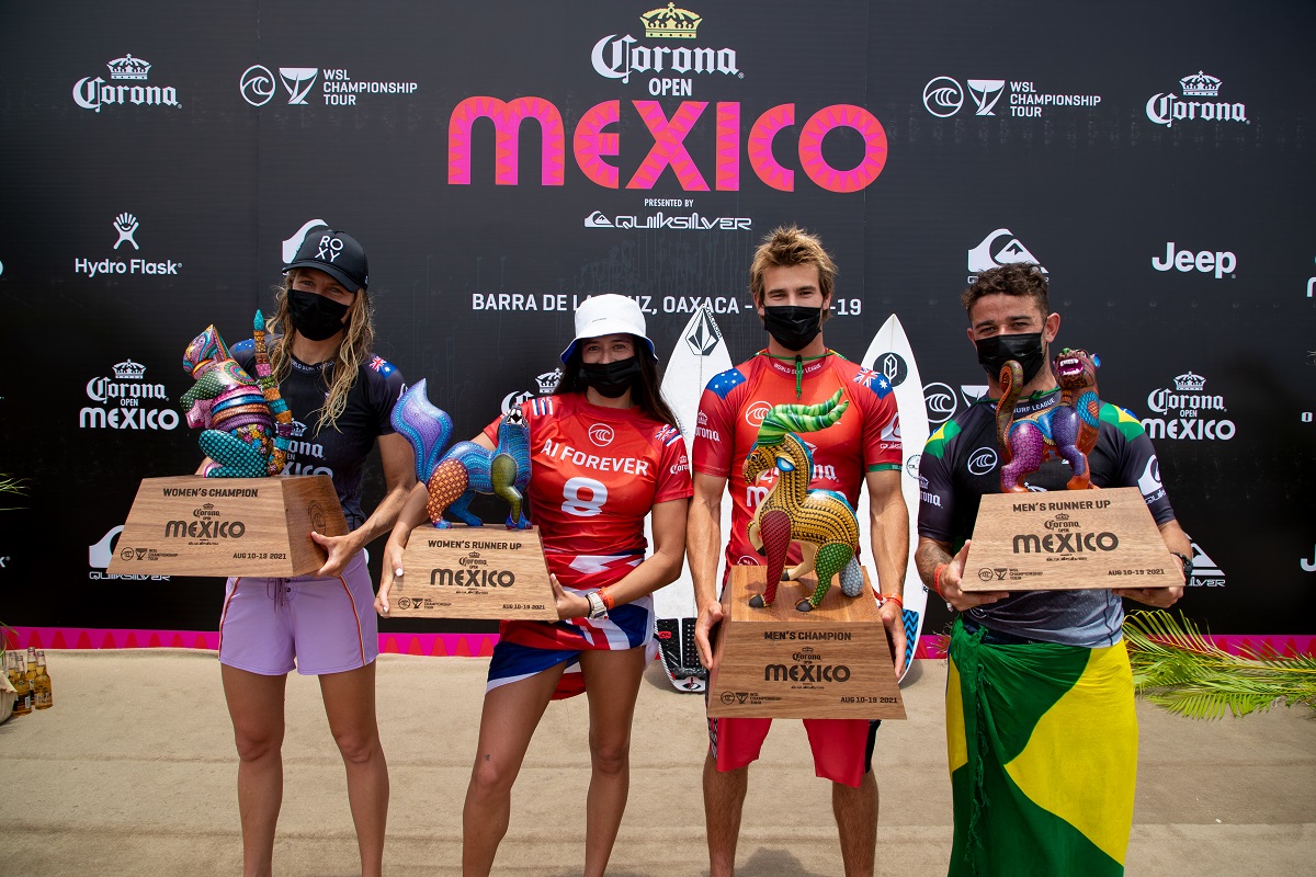 O Corona Open Mexico apresentado pela Quiksilver foi encerrado com chave-de-ouro, com os classificados para o último dia dando um show nas melhores ondas da semana em Barra de La Cruz. Depois do amplo domínio da seleção brasileira, ganhando cinco das seis etapas do World Surf League Championship Tour 2021 disputadas antes do México, foi a vez dos australianos fazerem a festa na sexta-feira, com as vitórias de Jack Robinson e Stephanie Gilmore. Mas, foi por pouco. O paulista Deivid Silva perdeu o título por 2 centésimos de diferença no placar de 15,16 a 15,14 pontos, enquanto a final feminina terminou em 15,83 a 15,27 pontos da havaiana Malia Manuel.