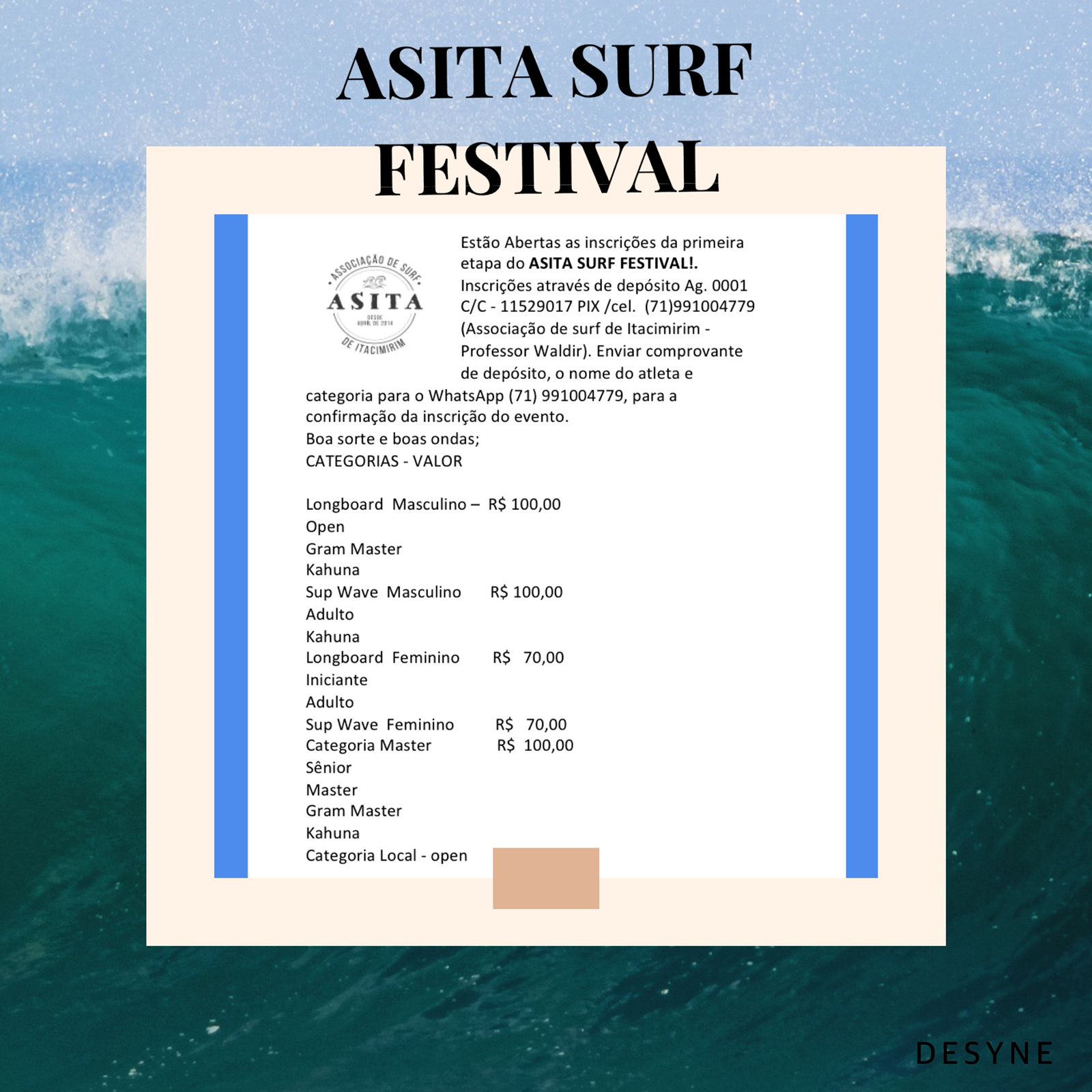 As inscrições estão abertas e podem ser feitas através de depósito na Ag. 0001 C/C - 11529017 Pix/cel. (71)991004779 (Associação de Surf de Itacimirim -Professor Waldir). Enviar comprovante de depósito, o nome do atleta e categoria para o WhatsApp (71) 991004779, para a confirmação da inscrição do evento.