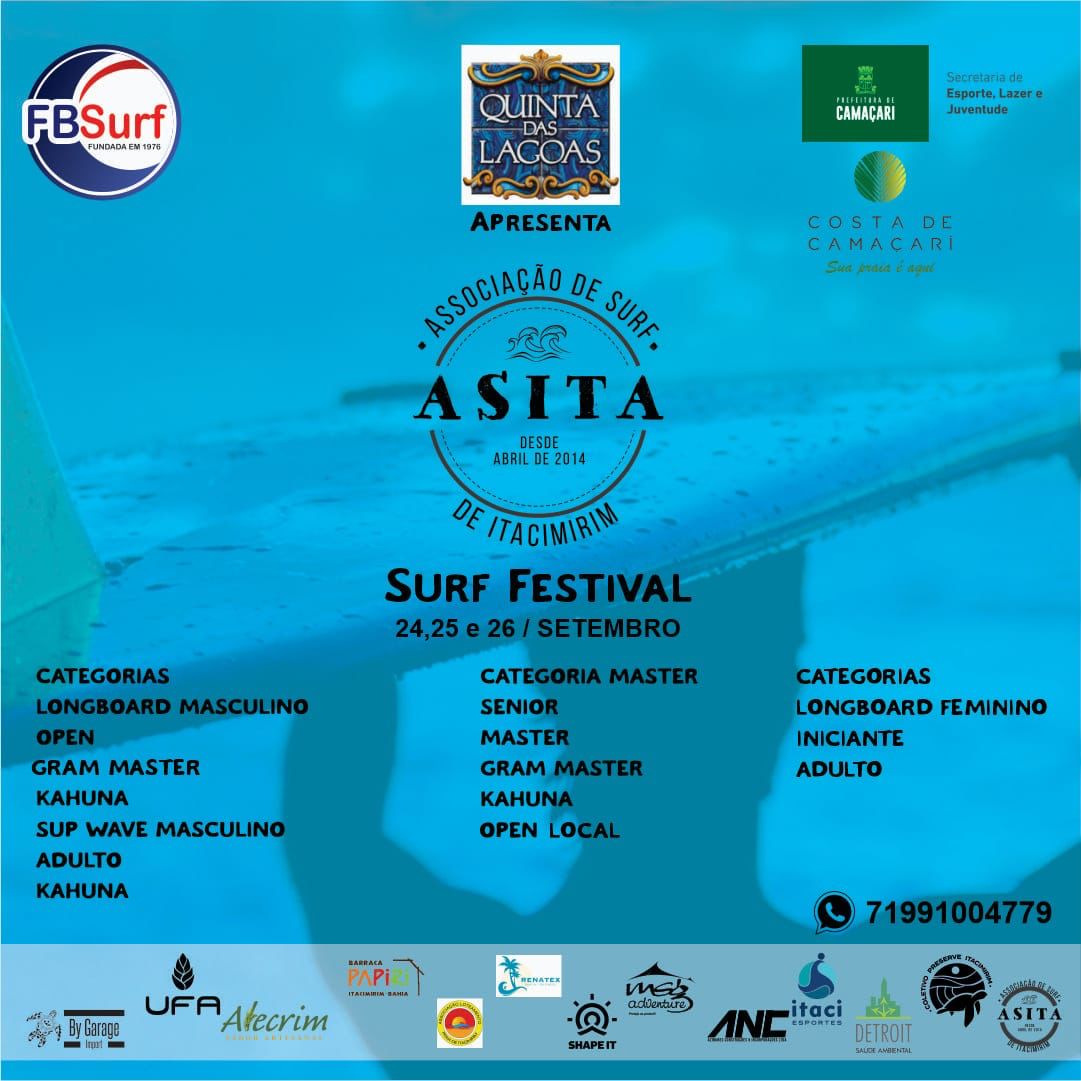 Entre os dias 24, 25 e 26 de setembro, acontece o ASITA Surf Festival, na praia do Surf, em Itacimirim, a primeira etapa do Circuito Baiano Master, Longboard e Sup Wave, todas as catagorias valendo pelo ranking Baiano.