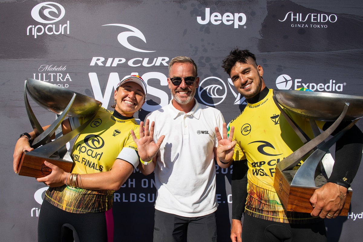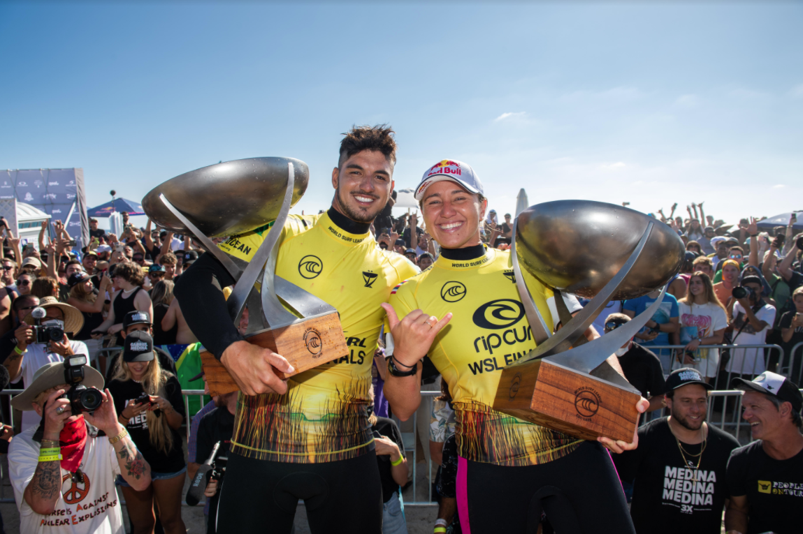 O fenômeno Gabriel Medina é o sexto surfista da história a conquistar três títulos mundiais, sacramentando o pentacampeonato do Brasil com um show na decisão verde-amarela com Filipe Toledo nas boas ondas de 4-6 pés de Lower Trestles. na terça-feira em San Clemente, na Califórnia, Estados Unidos. O Rip Curl WSL Finals foi encerrado com Tatiana Weston-Webb tentando ser a primeira campeã mundial do Brasil. Ela tinha vencido a primeira da melhor de três baterias com Carissa Moore, mas a havaiana ganhou as outras duas e festejou seu quinto título no pódio, junto com o camisa 10 da seleção brasileira da WSL, Gabriel Medina.