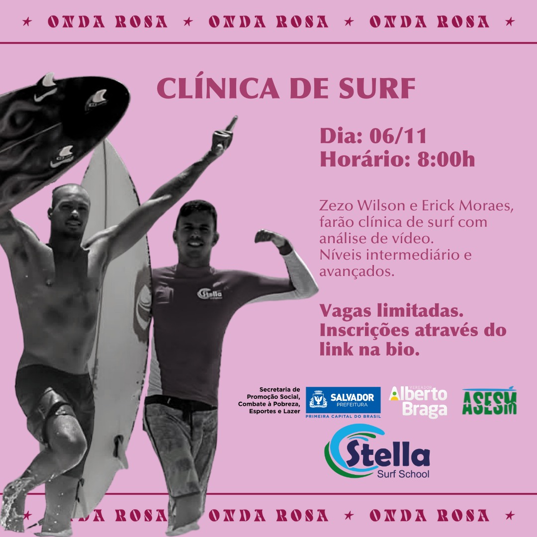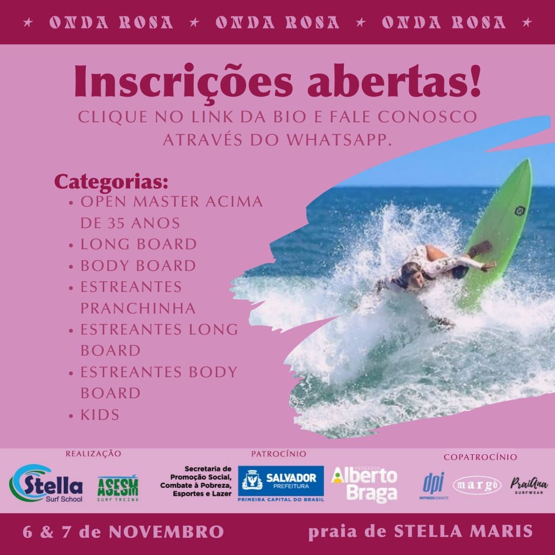 Nos dias 6 e 7 de Novembro, teremos na praia de Stella Maris, o evento “Onda Rosa”, que visa promover a integração sadia do surf feminino entre praticantes, amantes do esporte e comunidade local.