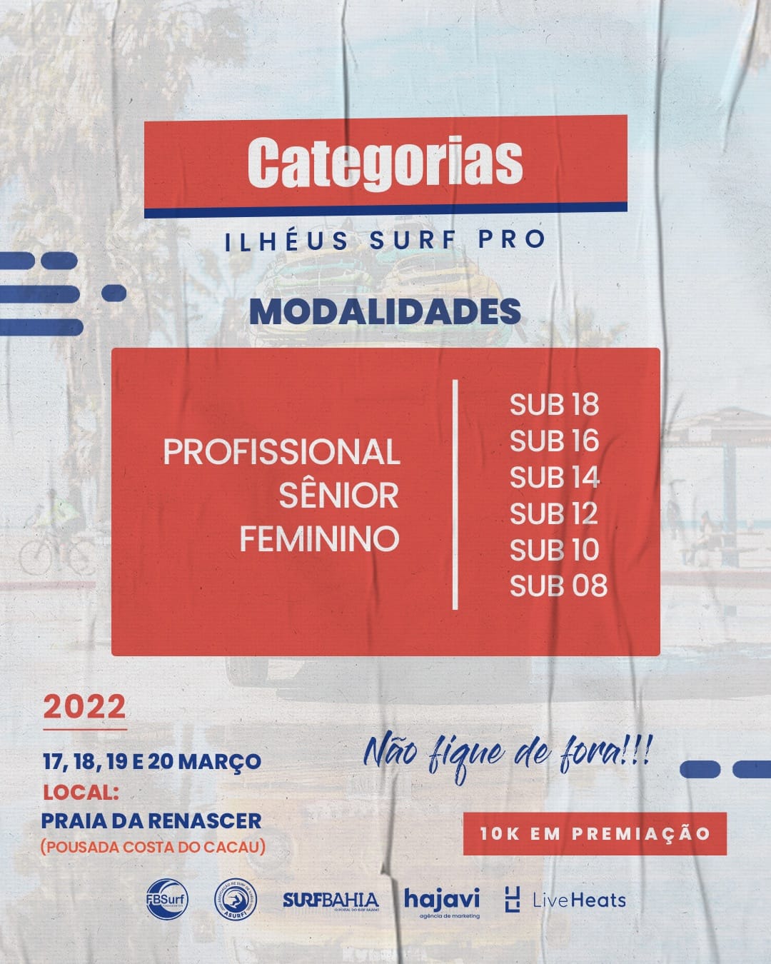 O evento acontece na praia da Renascer, na zona sul de Ilhéus e vai contar com disputas nas categorias amadoras Sub 8, 10, 12, 14, 16 e 18, Sênior e Feminino, além da Profissional, que vai distribuir 10 mil reais em premiação.