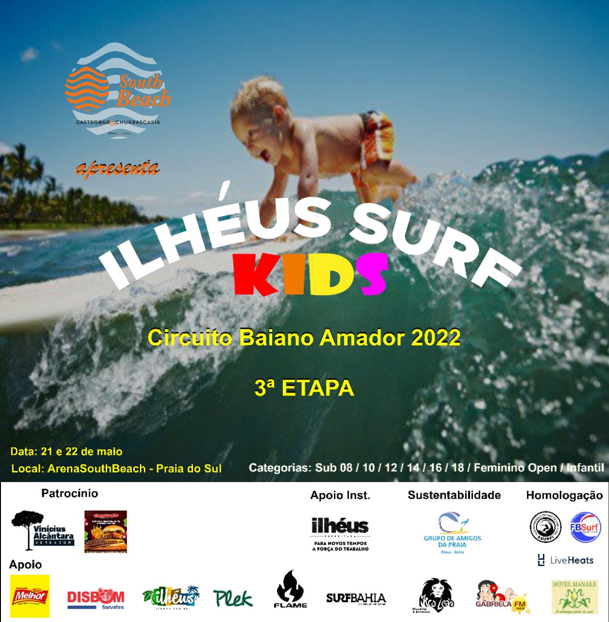 Nossos(as) pequenos(as) surfistas, baianos(as), vão se encontrar para essa festa que será o ILHÉUS SURF KIDS 2022. Etapa válida pelo Circuito Baiano de Surf Amador. O evento acontecerá na Arena South Beach, praia do Sul, nos dias 21 e 22 de maio.