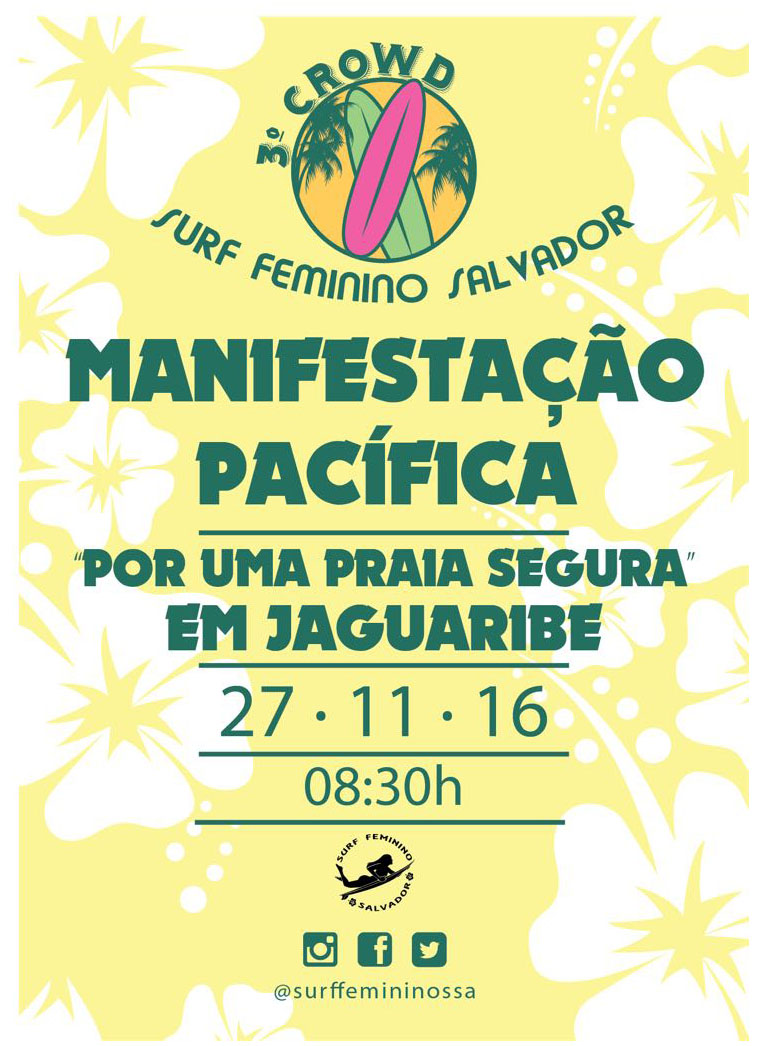 No próximo dia 27 de novembro, às 8:30h, o grupo Surf Feminino Salvador vai promover uma manifestação pacífica na praia de Jaguaribe, em Salvador (BA), em protesto à grande violência na capital baiana.