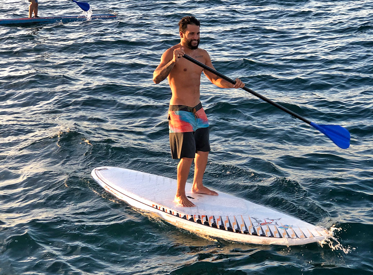 Depois de oito horas no veleiro, Italo Ferreira voltou rapidamente ao hotel e saiu para jantar com o nutricionista Daniel Cady e seu filho Marcelo, de 12 anos, que pôde realizar o sonho de conhecer o campeão mundial e olímpico de surf.