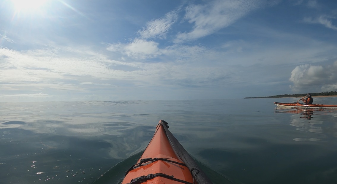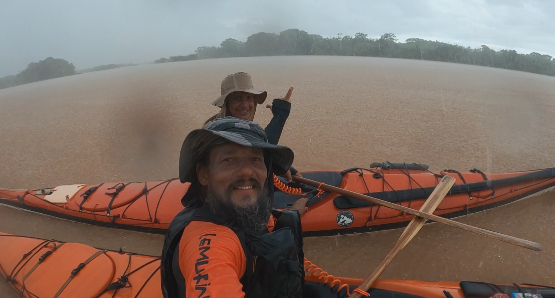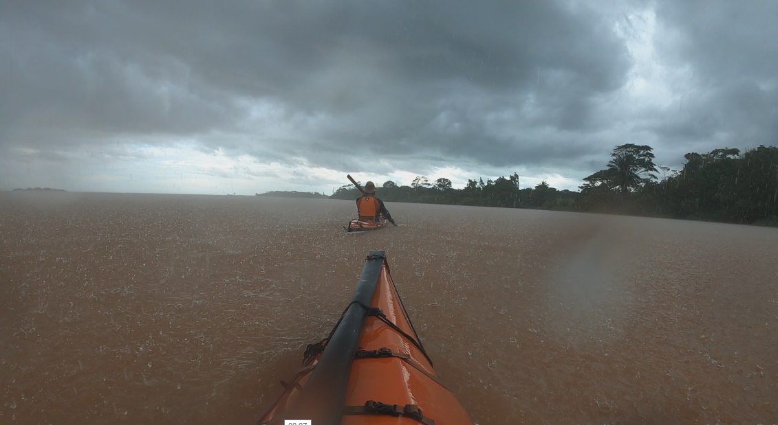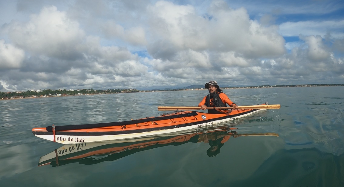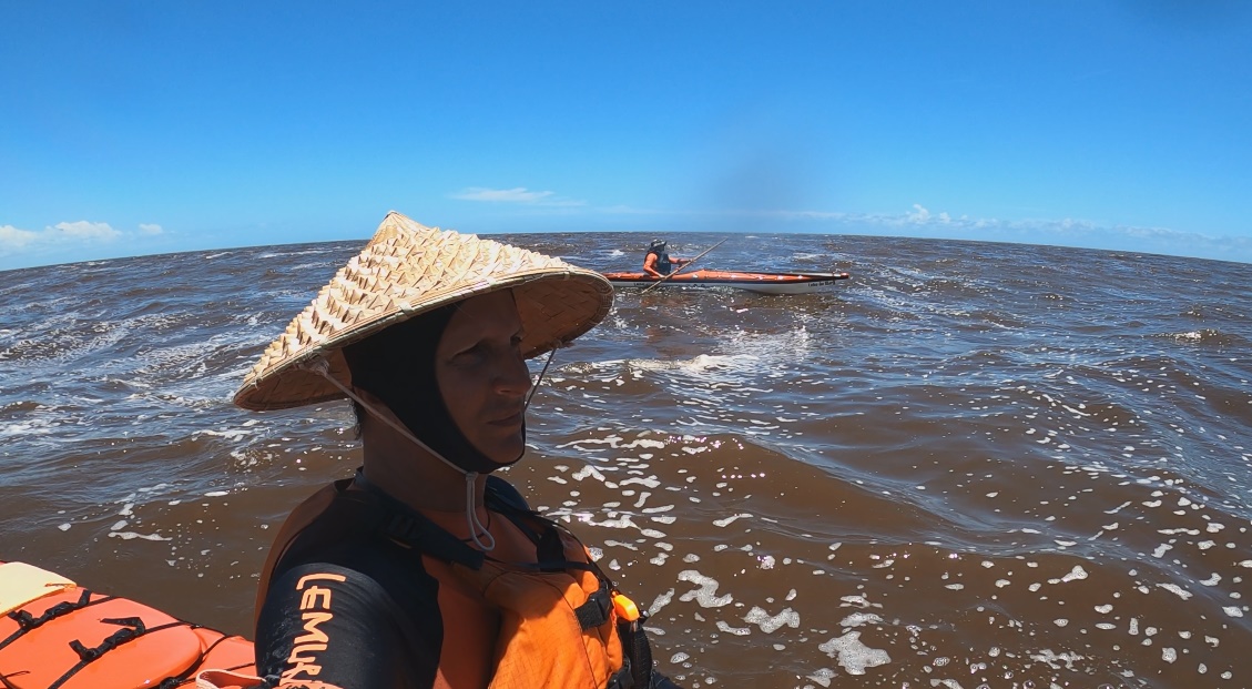 Na turbulência da forte arrebentação, tive dificuldade em me livrar da saia que veda o cockpit e que nos prende ao caiaque. Ao chegar ofegante à superfície, pude ver meu parceiro Hamiltinho capotando também ao tomar uma grande onda na cabeça. Saímos ofegantes do mar que, com a maré cheia, tombava nossos caiaques com muita força na curta e inclinada bancada de areia. Na luta pra subir os caiaques perdemos uma bomba hidráulica, meu chapéu foi estraçalhado pelas ondas e só fui encontrar meu remo principal 400 metros ao sul, já que fora arrastado pela forte correnteza.