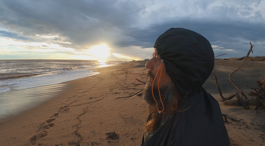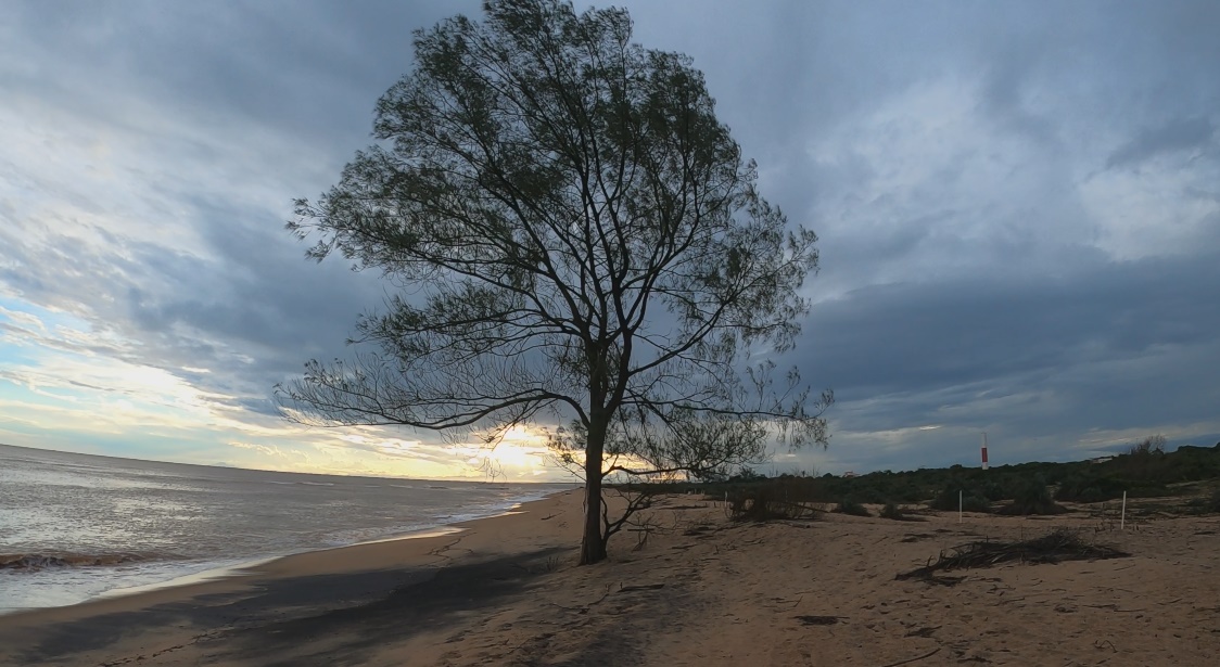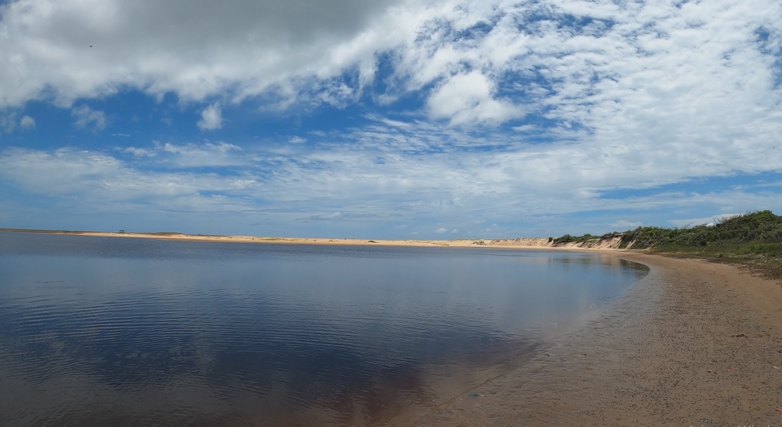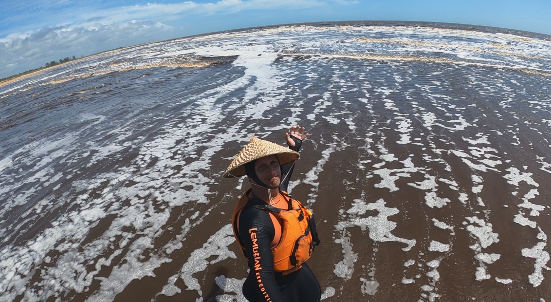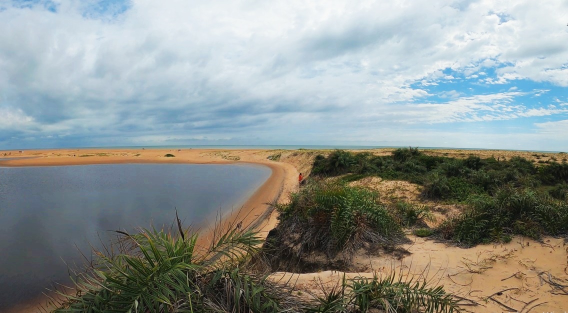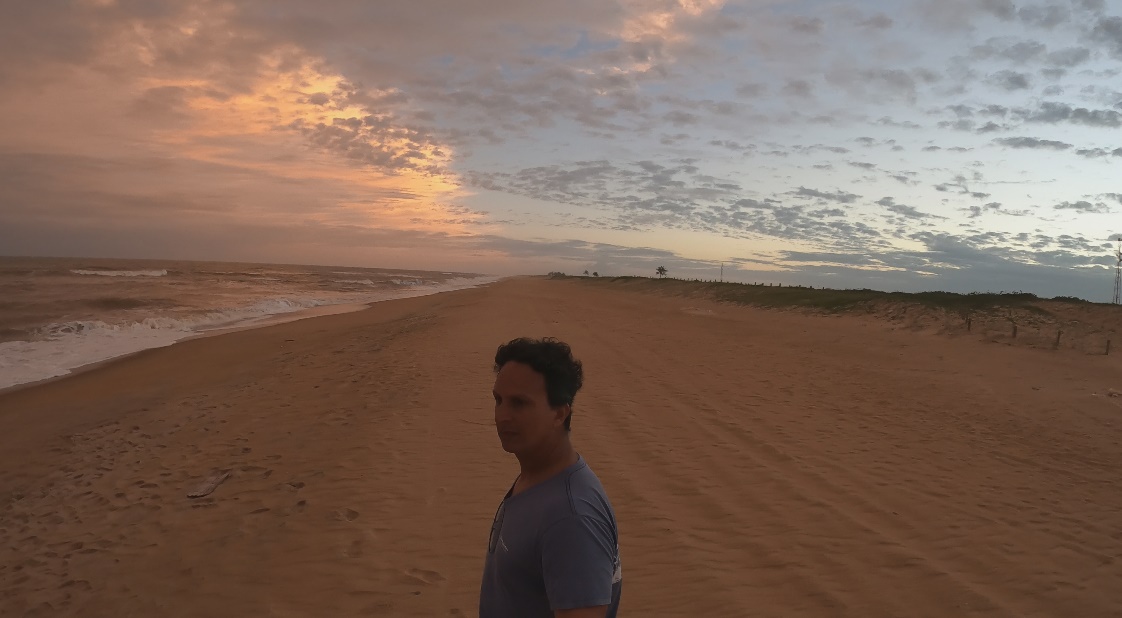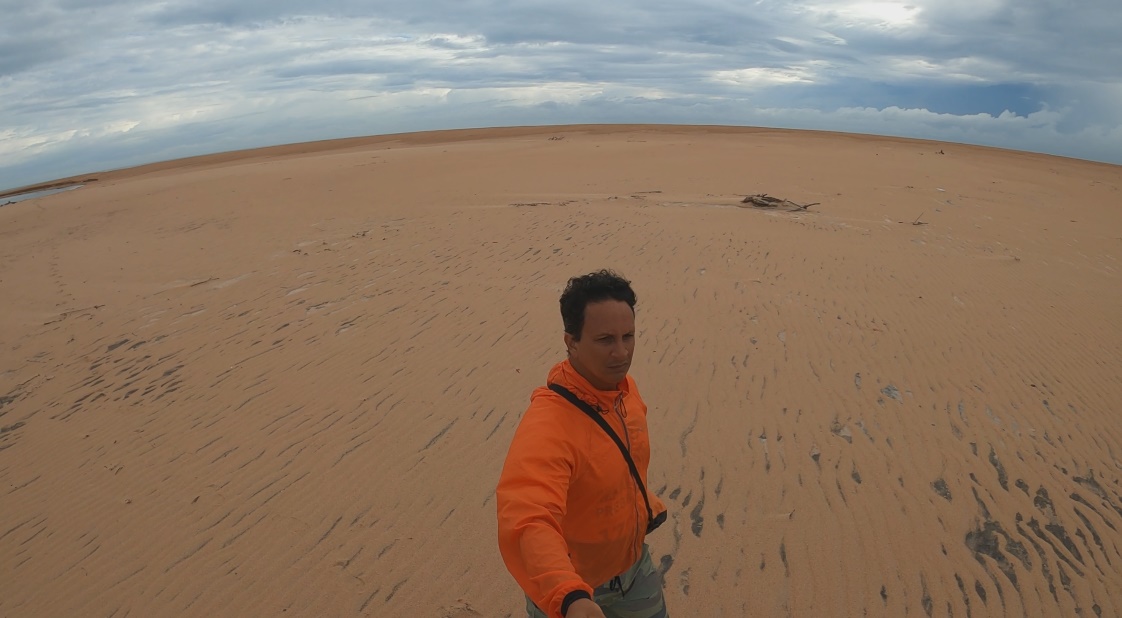 O novo cenário trouxe dunas de areia amarelada e restinga, quilômetros e mais quilômetros de praia, um grande deserto de mar marrom ou praticamente negro quando atravessávamos alguma foz de rio. Cansativo do ponto de vista emocional, já que sem alterações de cenário, as metas se resumiam em atingir uma longínqua ponta de praia que praticamente sumia no céu acinzentado. O ambiente se tornava assustador ao percebermos grandes e fortes ondulações rompendo com força, o que tornava nossas saídas e entradas no mar motivos de grande angústia e tensão.