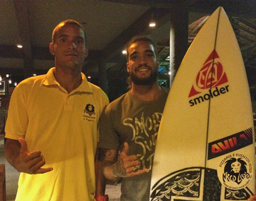 O atleta Franklin Serpa acaba de fechar mais uma parceria. Localizada em Olivença, a Pizzaria Mico Leão tem como dono Guilherme Tavares, surfista e local do Backdoor.